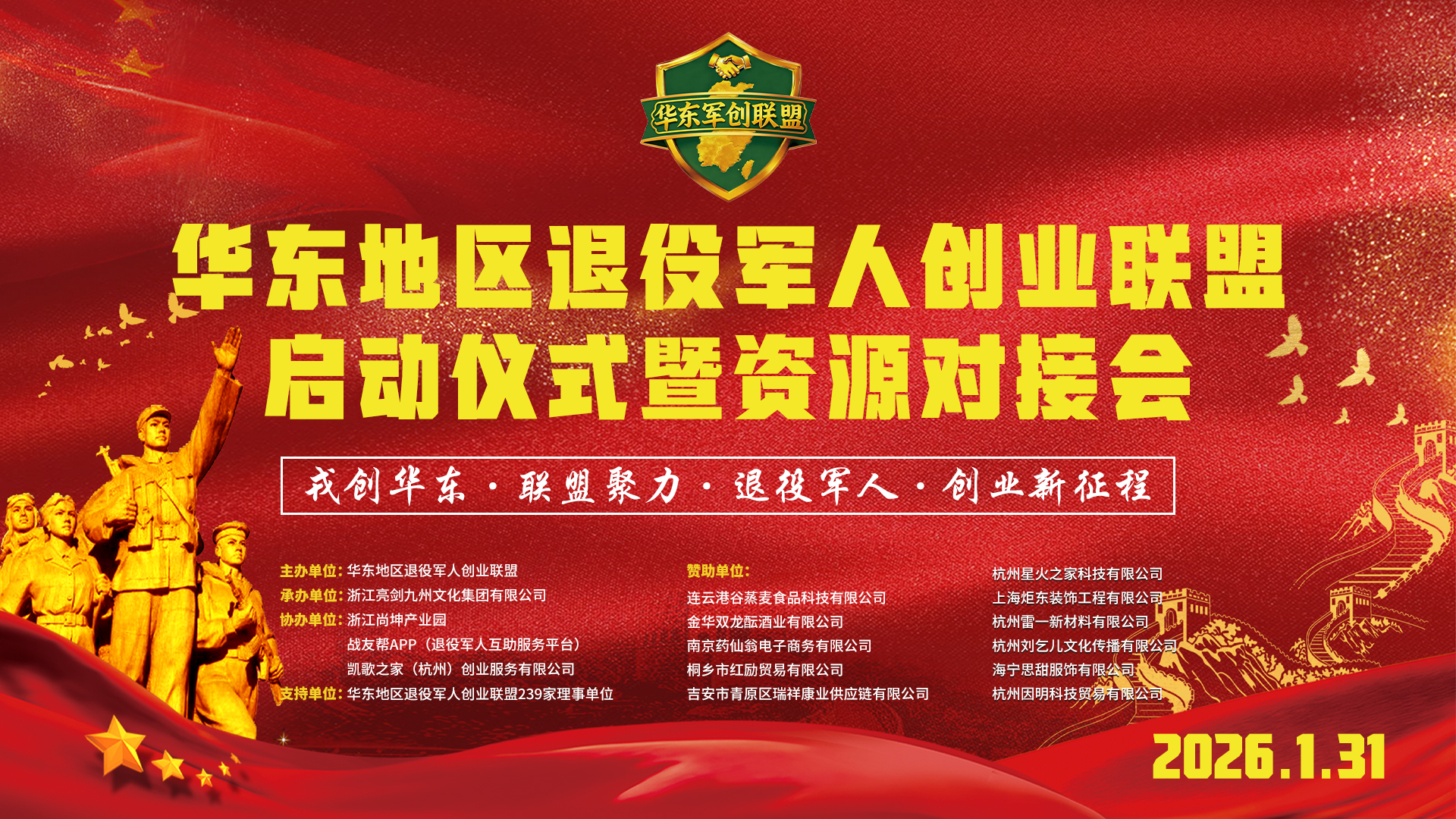 ——华东地区退役军人创业联盟启动仪式暨资源对接会圆满落幕 冬日暖阳映初心,戎创聚力启新篇。近日,华东地区退役军人创业联盟启动仪式暨资源对接会在杭州盛大启幕。本次活动以“戎创华东·联盟聚力·退役军人·创业新征程”为核心主题,汇聚联盟理事单位代表、金融界专家、优秀军创企业家及媒体同仁118人,来自六省一市,共同见证华东军创事业发展的重要里程碑,共商资源整合之道,共绘退役军人创业共赢新蓝图。 作为华东地区退役军人创业领域的一次盛会,本次活动由华东地区退役军人创业联盟主办;浙江亮剑九州文化集团有限公司承办;浙江尚坤产业园、战友帮APP(退役军人互助服务平台)、凯歌之家(杭州)创业服务有限公司联合协办;连云港谷蒸麦食品科技有限公司、金华双龙酝酒业有限公司、南京药仙翁电子商务有限公司、桐乡市红励贸易有限公司、吉安市青原区瑞祥康业供应链有限公司、杭州星火之家科技有限公司、上海炬东装饰工程有限公司、杭州雷一新材料有限公司、杭州刘乞儿文化传播有限公司、海宁思甜服饰有限公司、杭州因明科技贸易有限公司等11家赞助单位鼎力襄助;并得到239家联盟理事单位大力支持。 活动以“启动联盟、搭建资源对接平台、凝聚区域军创力量”为三大核心目标,旨在让“退役不褪色、建功新时代”的铮铮誓言在华东大地落地生根、开花结果,为退役军人创业之路铺就坚实桥梁。启动仪式上,气氛庄重而热烈。柴宇球将军发表贺信,既肯定了退役军人在创业道路上展现出的坚韧意志与实干精神,也对联盟未来发展寄予深切厚望,字里行间饱含着对退役军人战友的深情嘱托与坚定支持,让现场创业者备受鼓舞。随后,联盟执行主席汪勇成讲诉联盟初心与使命,通过企业集体盖章设立联盟,成立理事会,这份沉甸甸的名单承载着责任与担当,标志着华东地区退役军人创业联盟正式迈入落地发展新阶段。 活动现场,全体与会人员共同见证了盟约与誓词的庄严宣读。盟约明确:“吾辈承军旅之魂,怀实干之志,聚于华东热土,共建资源联盟。不以规模论高低,不为规则设壁垒,唯以低门槛纳伙伴,以人性化暖人心。” 誓词则彰显初心:“守军人本色,勇担使命;循商业正道,恪守底线;护战友情谊,同心共济;建生态闭环,不弃细行。” 字字铿锵有力,既凝聚了全体盟员的共同信念,也勾勒出联盟“资源共享、互助协作、务实笃行、诚信共赢”的发展理念,誓将联盟打造成战友创业的“加油站”与军创生态的“奠基石”。 联盟主席何敏先生发表讲话并发出联盟倡议,从整合全链条创业资源、搭建全方位赋能平台、构建全周期服务体系等方面,清晰擘画了联盟未来发展路径,为凝聚华东军创合力、推动区域军创事业高质量发展指明了方向。为切实为退役军人创业保驾护航,活动特别设置政策解读与金融助力两大核心环节。尚坤集团军创代表、高级顾问杨立金先生围绕退役军人创业扶持政策展开细致解读,从创业培训、项目孵化到资源对接、政策红利等方面,全方位呈现“干货满满”的政策支持体系,为创业者提供清晰指引;中国银行杭州西城支行行长邹鸿健先生带来精准化金融知识宣导与普惠金融产品分享,贴心的贴息政策、定制化的金融服务,为军创项目注入“金融活水”,有效破解创业资金难题。 在优秀军创项目分享环节,11位军创企业家依次登台,带来涵盖多领域的精彩展示。蒸谷牌®蒸谷米、双龙洞®莲子酒、战友帮APP退役军人互助服务平台、野战队®椰子水、药仙翁®药茶、乌镇缘®AI智能被、瑞祥康业®祛痛液、星火之家®流量工厂、刘乞儿®菜刀、远方安选®社区小店、甘孜州农产品、亮剑九州®军事特训、亮剑九州®旗袍赛事,既有特色农产品创新,也有战友服务平台搭建,还有军事特训文化赛事平台,每个项目都凝结着退役军人的智慧与汗水,充分展现了军创领域的多元潜力与广阔前景,为现场创业者提供了宝贵的实践借鉴与思路启发。 分享结束后,1分钟自我介绍环节点燃现场互动热情。在座退役军人战友踊跃发言,简洁明了地介绍自身企业、创业项目及核心产品,在高效沟通中增进了解、寻觅商机,传递出浓厚的创业热忱与合作诚意。随后,名誉主席常建、朱剑锋、姬彪、李正亮,高级顾问孟智辉、倪焕真、杨立金,特邀嘉宾浙江省省政府参事王济民发表精彩寄语,他们结合自身经验为联盟发展建言献策,为退役军人创业者加油鼓劲,字字珠玑、句句恳切,注入强大精神动力。肯定联盟成立的重要价值,对联盟未来发展提出期望,鼓励退役军人永葆军人本色,在创业路上勇毅前行。 启动仪式核心环节结束后,与会人员有序移步一楼参观,近距离感受军创企业的发展成果与创新活力。随后,大家在基地大门口台阶处拍摄大合影,定格这一具有历史意义的时刻。当晚全体嘉宾围绕联盟发展规划、军创项目深化、产品资源对接等议题展开深入交流,在畅叙战友情怀的同时,进一步凝聚合作共识,为后续携手发展筑牢基础。 此次华东地区退役军人创业联盟启动仪式暨资源对接会的成功举办,不仅搭建起华东地区退役军人创业资源共享、优势互补、合作共赢的重要平台,更标志着区域军创事业迈入协同发展的新阶段。未来,联盟将持续发挥桥梁纽带作用,整合政策、金融、项目、人才等多方资源,强化创业扶持、金融赋能与项目孵